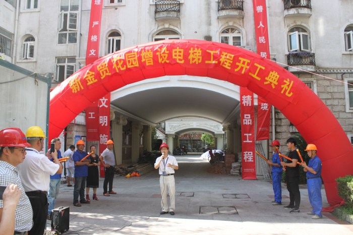 2017年8月24日上午8:00时分,南京市区风和日丽,位于南京市鼓楼区的新金贸花园小区主道路两旁一派喜庆热闹的景象:一个大大的拱形大红气球门上写着“新金贸花园增设电梯工程开工典礼”几个醒目的大字。4条长长的横幅分别从7楼顶处及2楼处高挂而下,横幅上“创建精品工程,安全文明施工”这些白色的大字同样引人注目。
